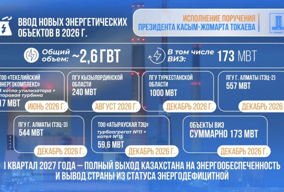 В 2026 году в Казахстане будет введено около 2,6 ГВт новой генерации, включая 173 МВт объектов ВИЭ